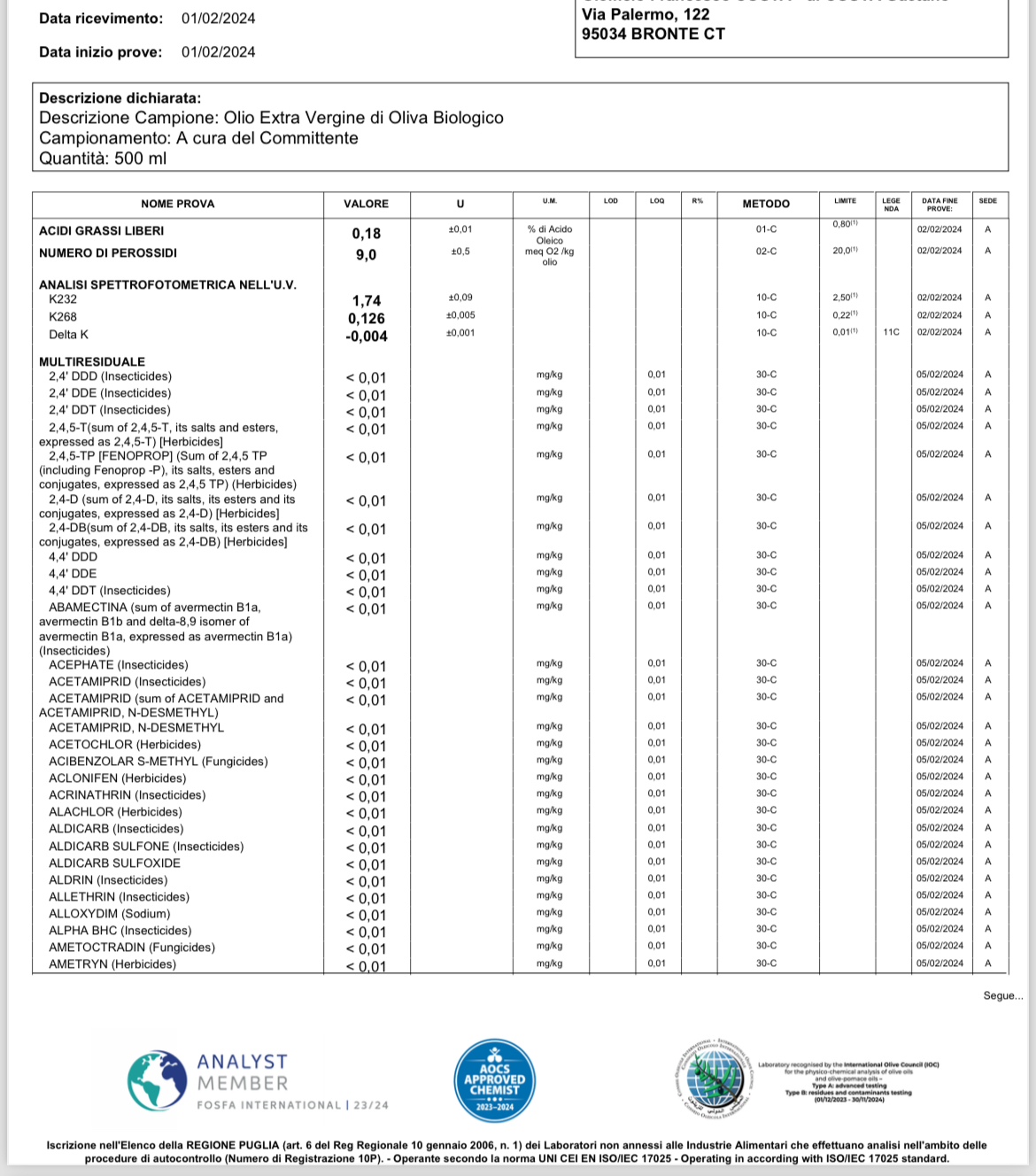 Pochodzenie surowców: prywatne oliwki nalężące do TEKNAFOOD, z gaju producenta CAMUTO (950m.n.p.n) Bronte (CT)